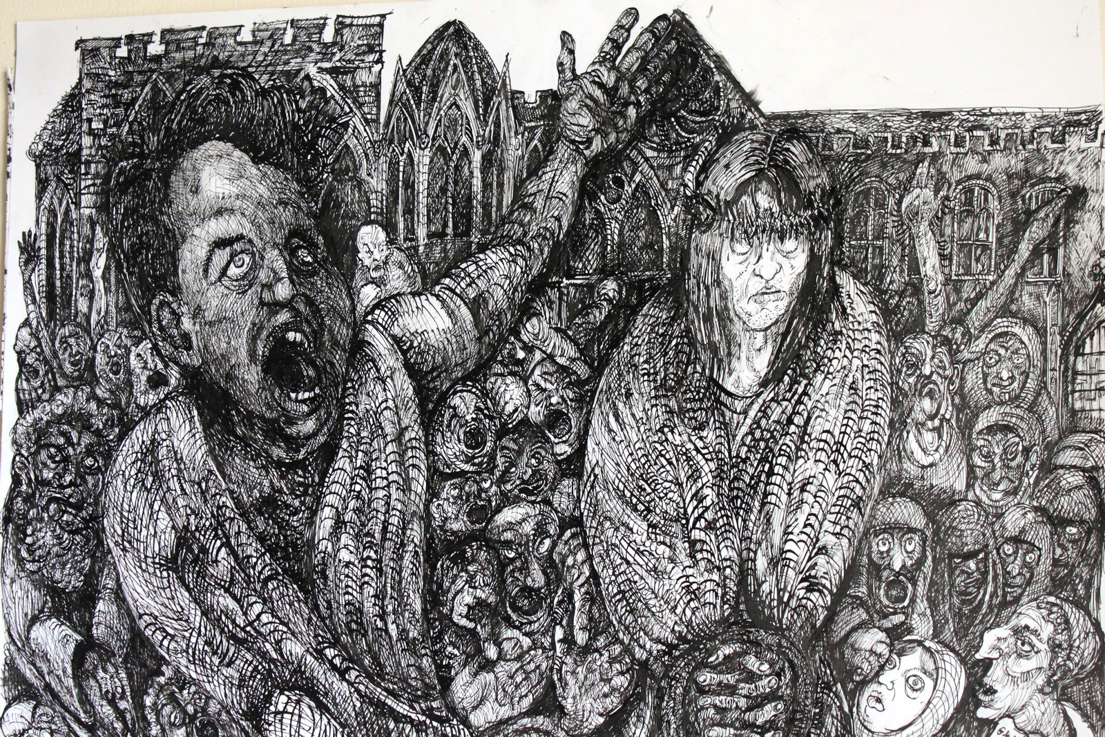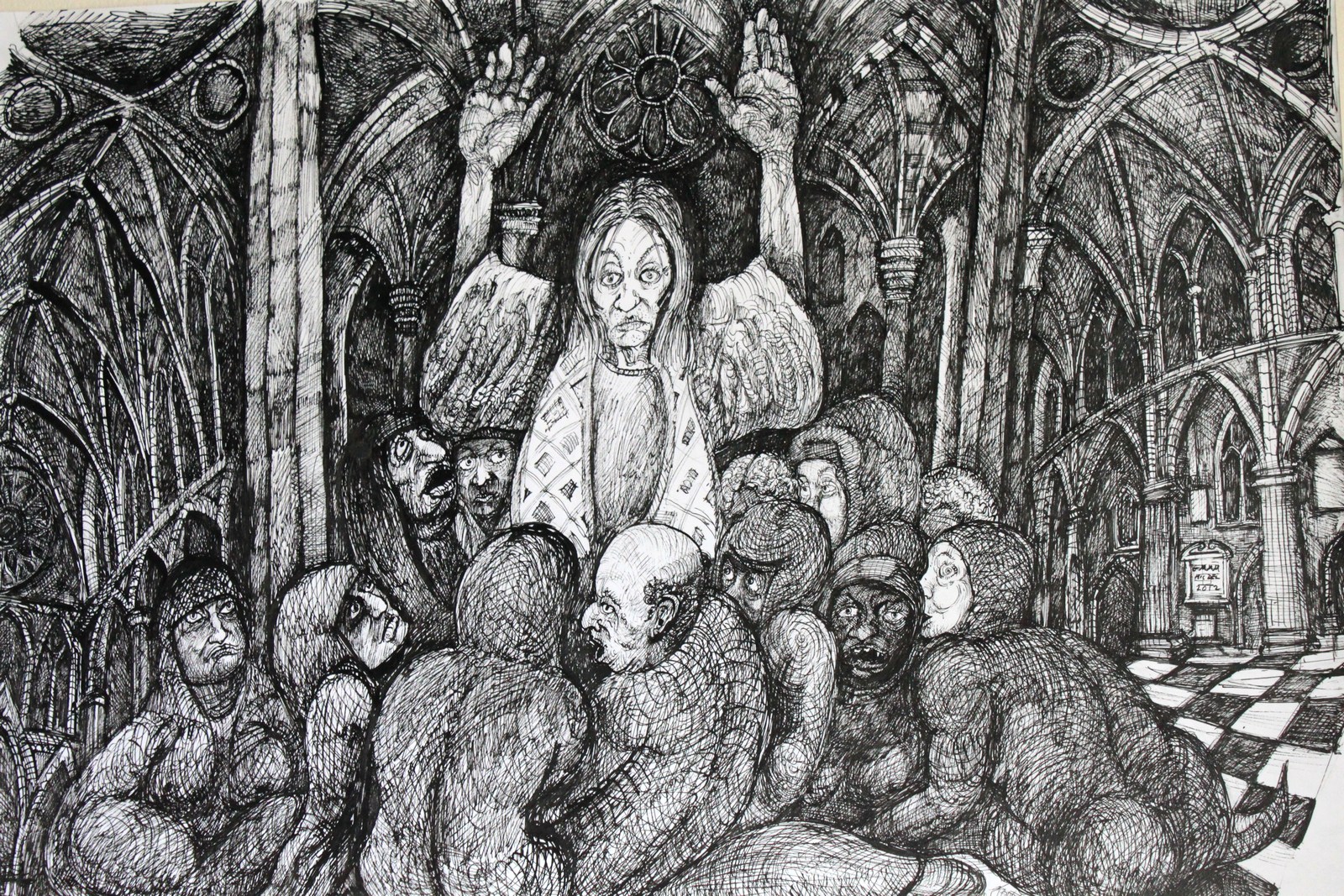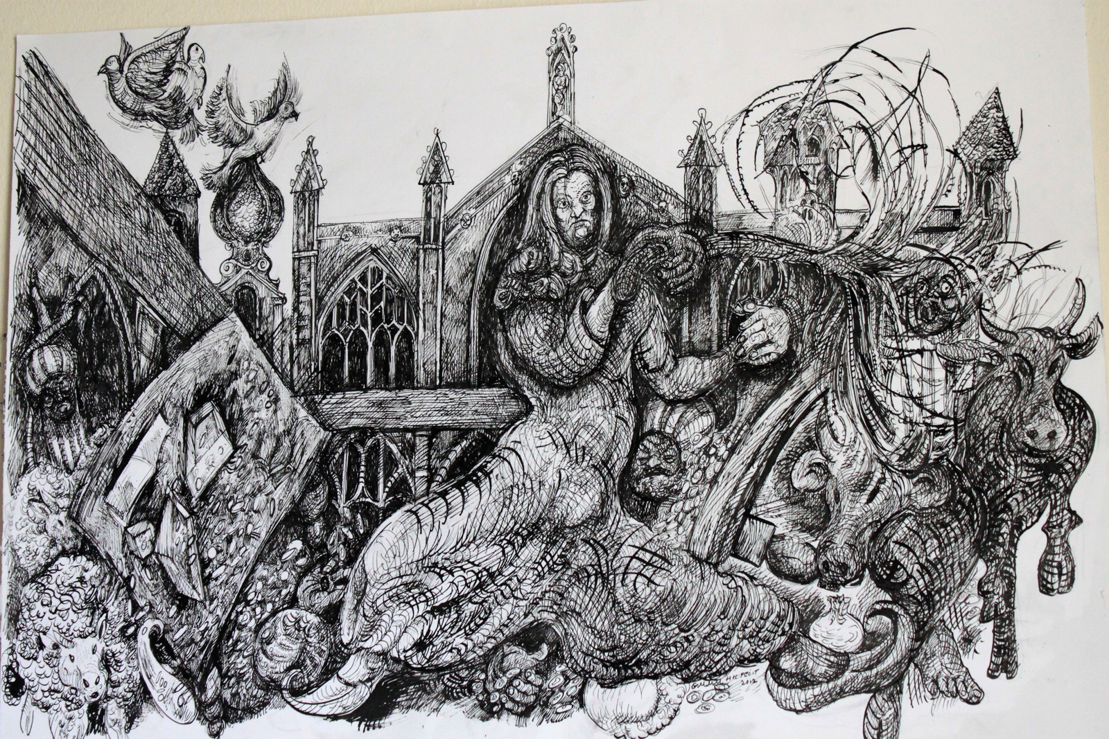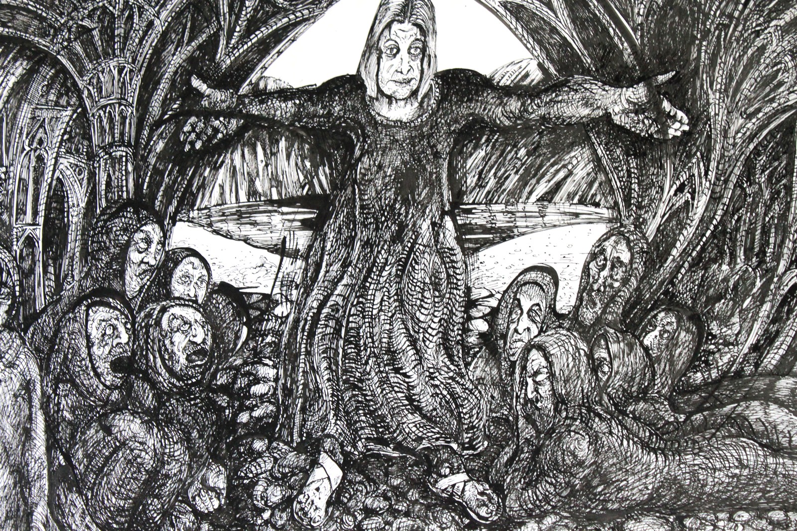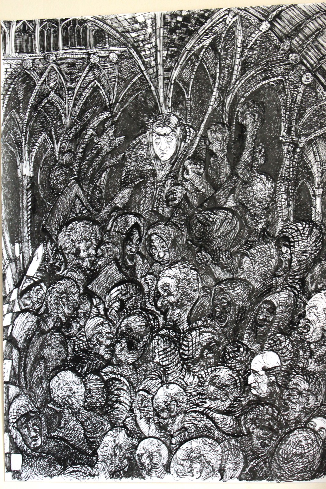 The medium is black ink. I have used an old-fashioned dipping pen and a variety of nibs. It was my intention to reproduce something of the visual power of late mediaeval German woodcuts. They are necessarily dark, both because of the subject matter and the method I have employed.