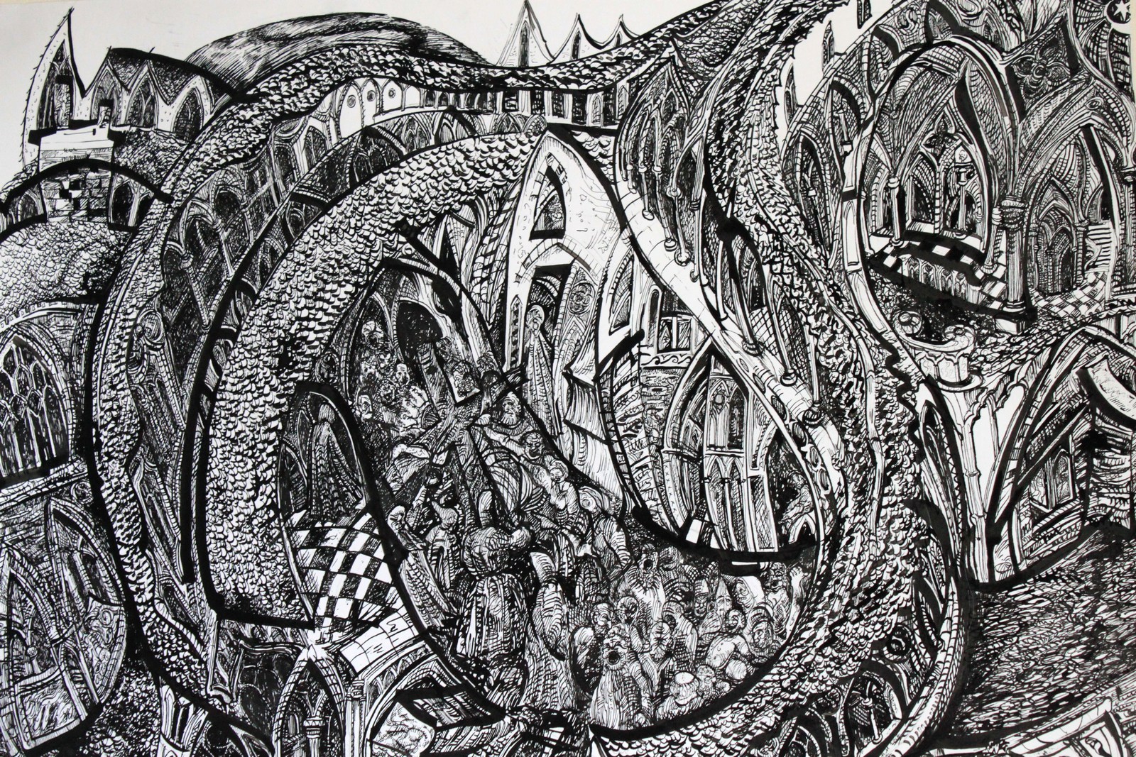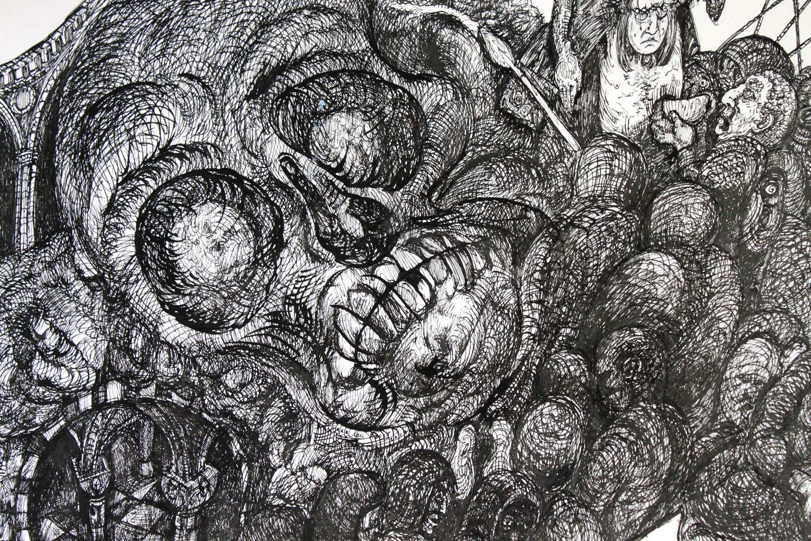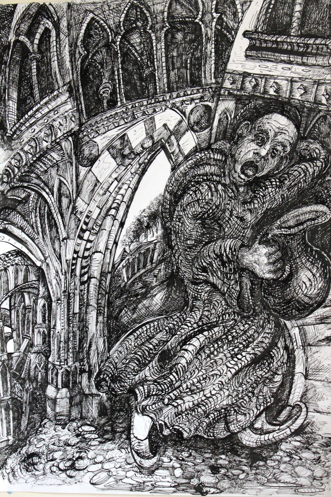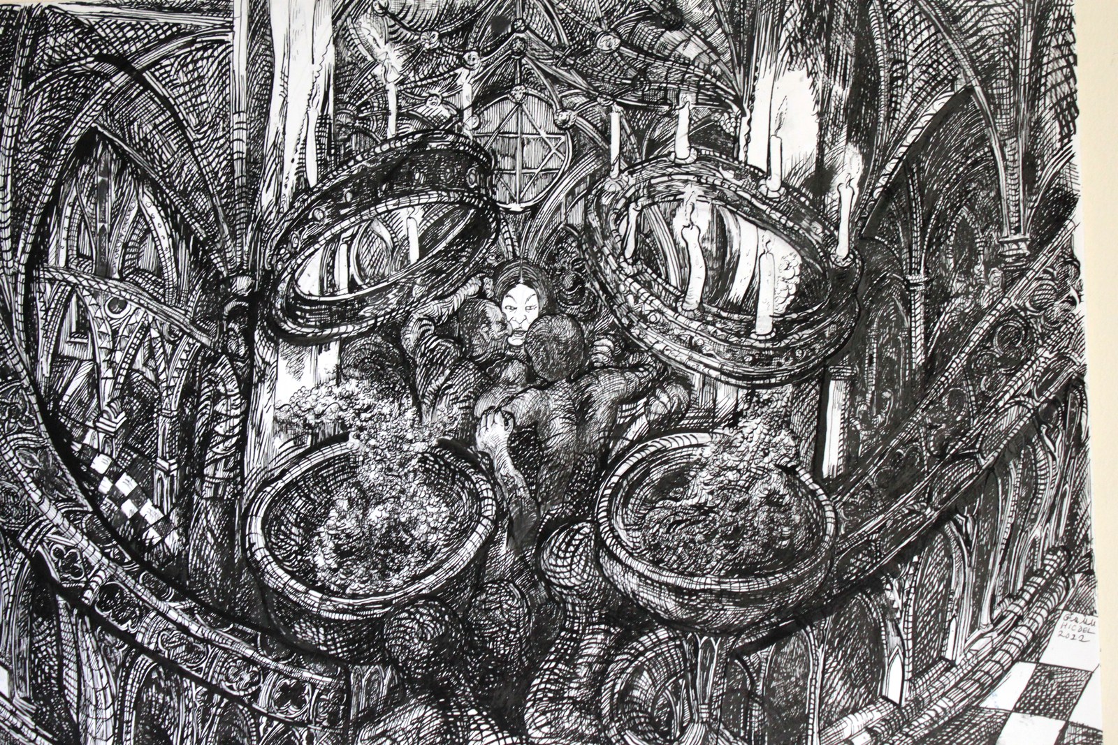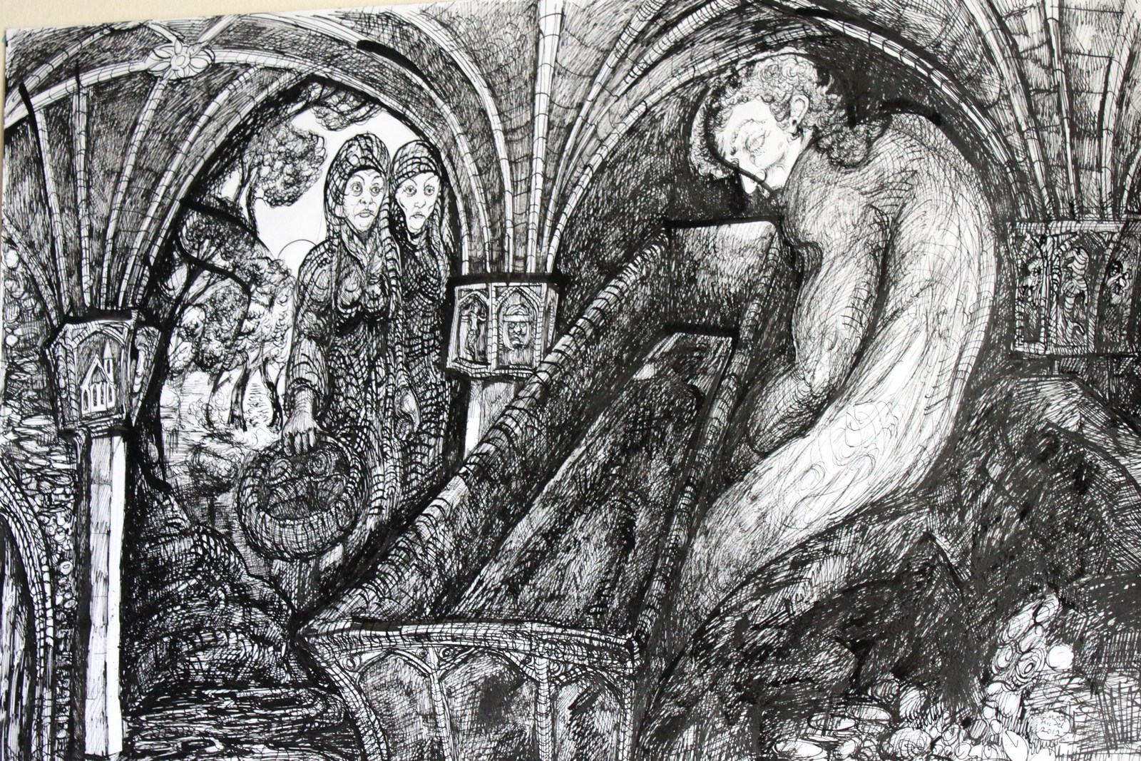 The medium is black ink. I have used an old-fashioned dipping pen and a variety of nibs. It was my intention to reproduce something of the visual power of late mediaeval German woodcuts. They are necessarily dark, both because of the subject matter and the method I have employed.