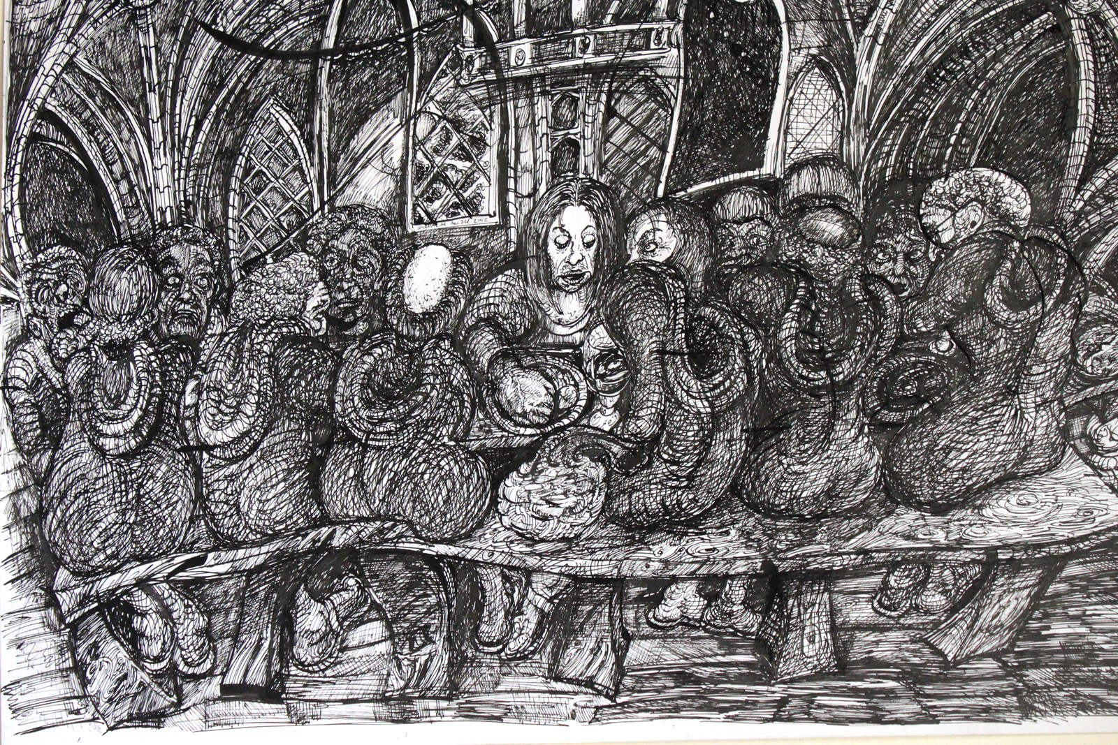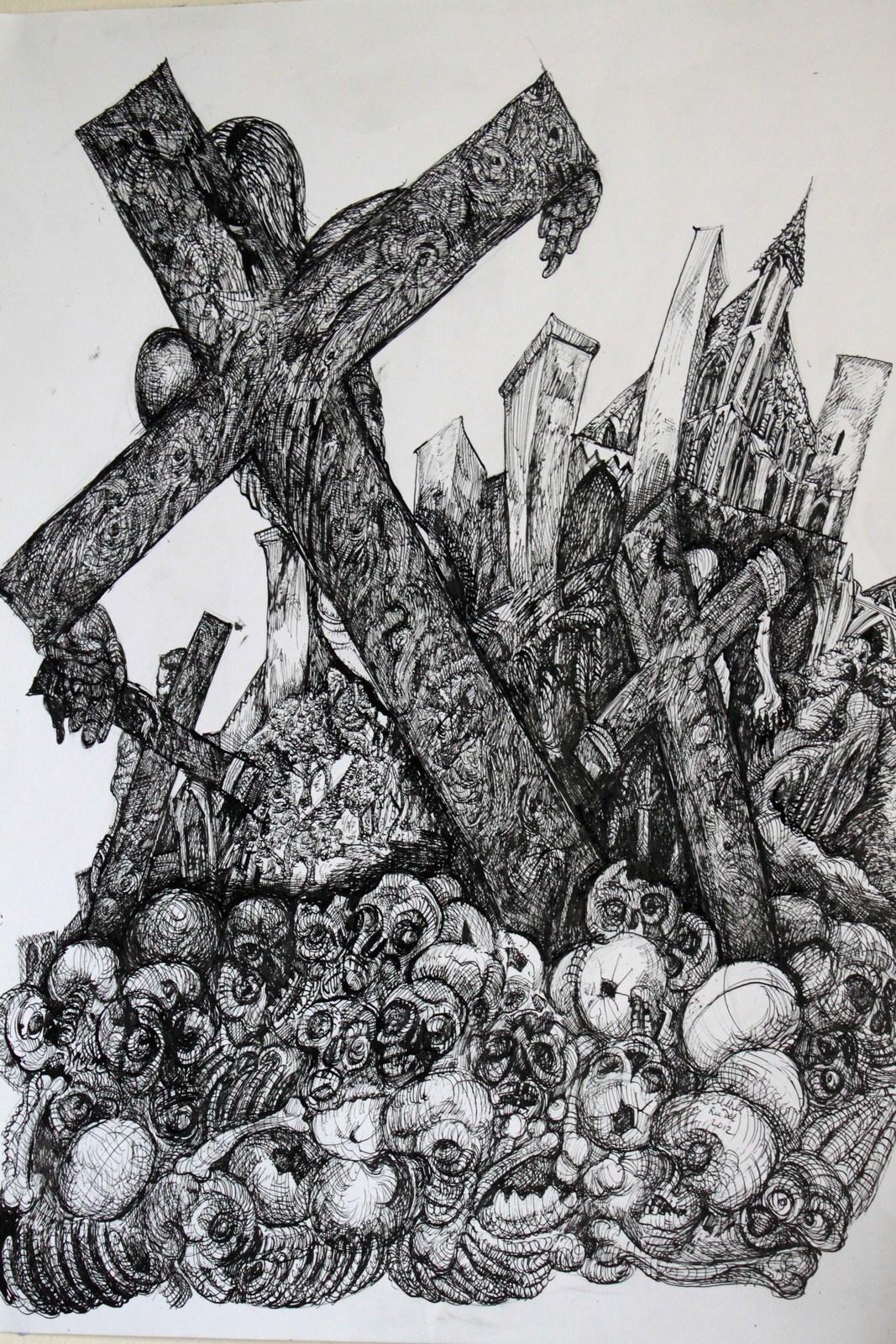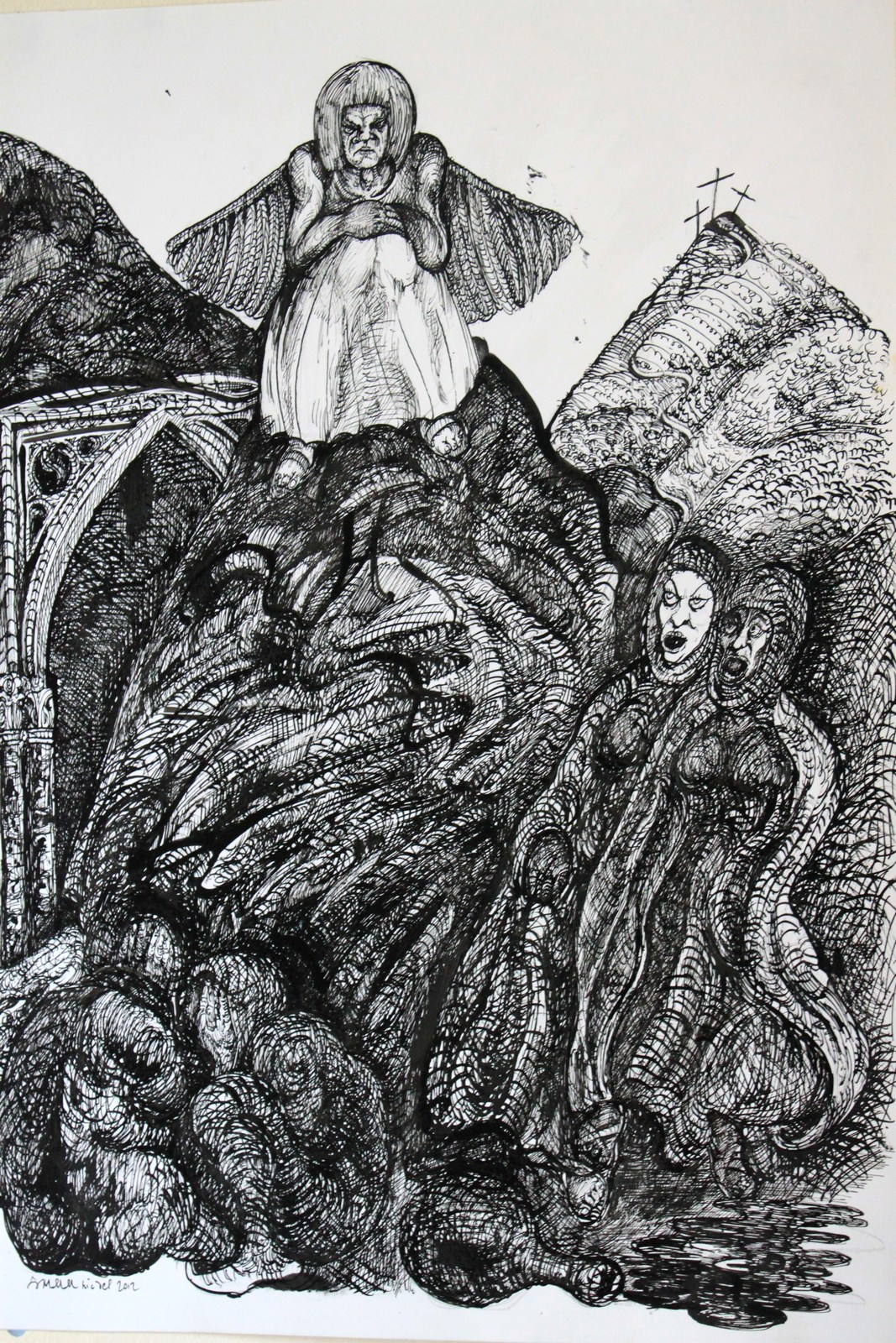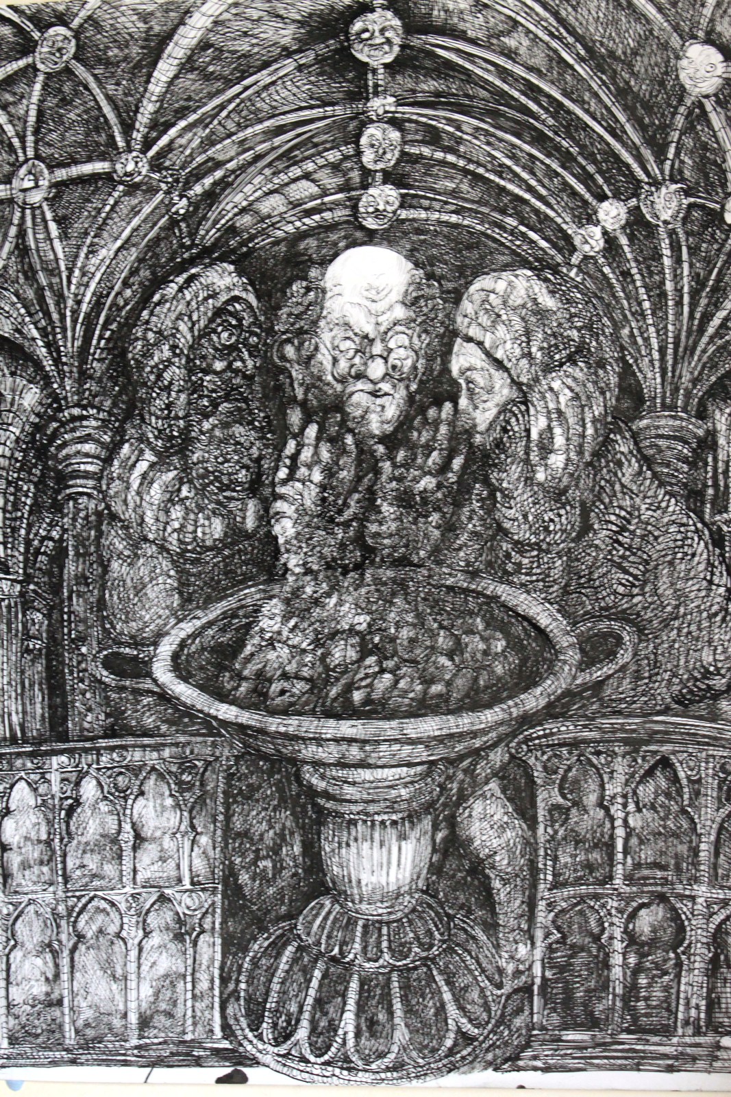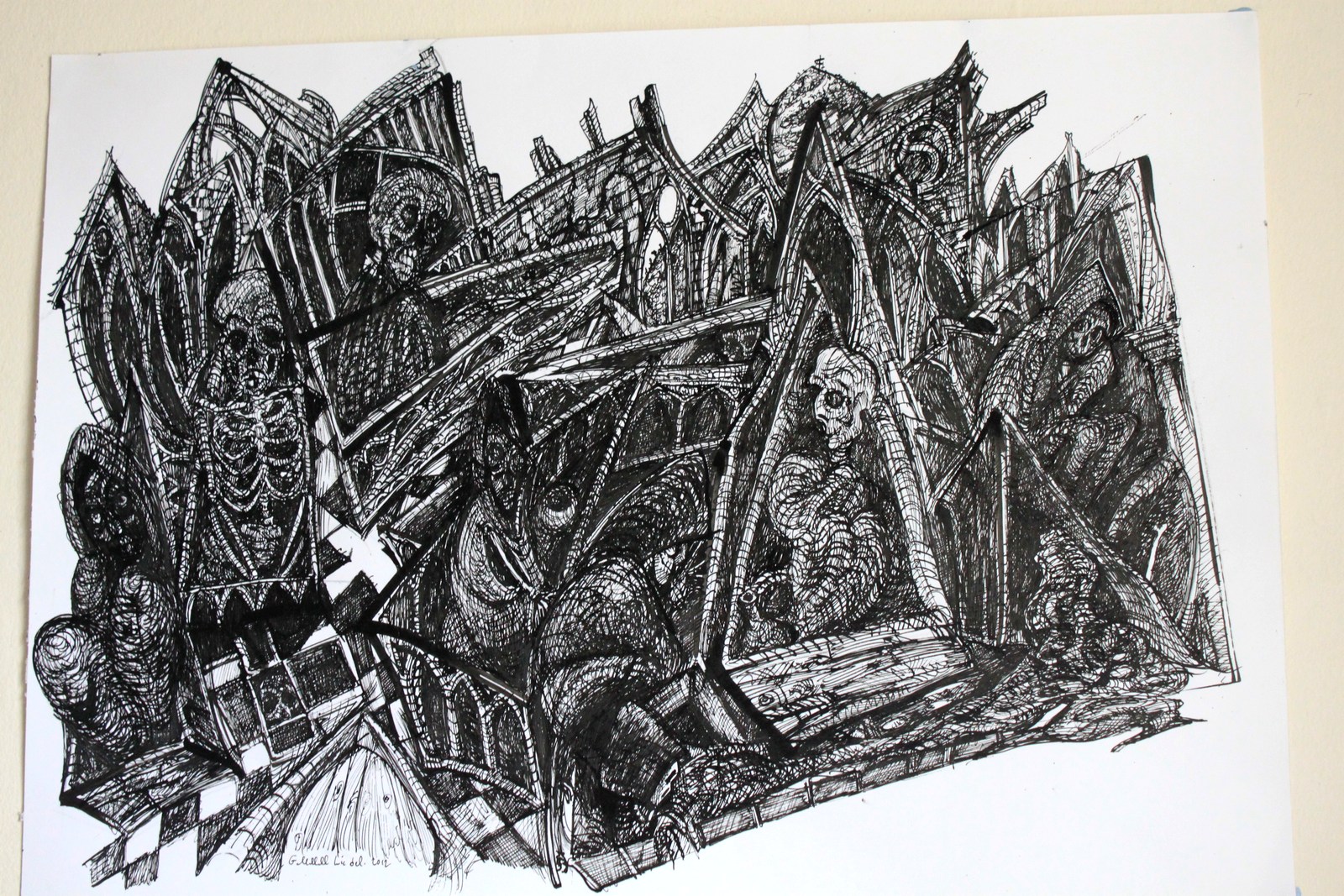The medium is black ink. I have used an old-fashioned dipping pen and a variety of nibs. It was my intention to reproduce something of the visual power of late mediaeval German woodcuts. They are necessarily dark, both because of the subject matter and the method I have employed.