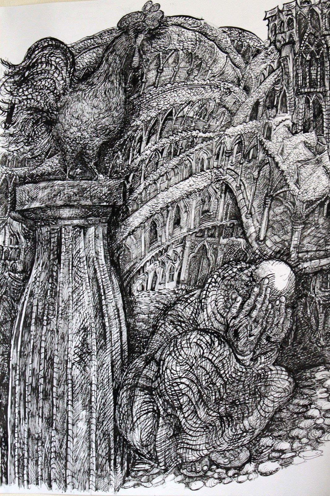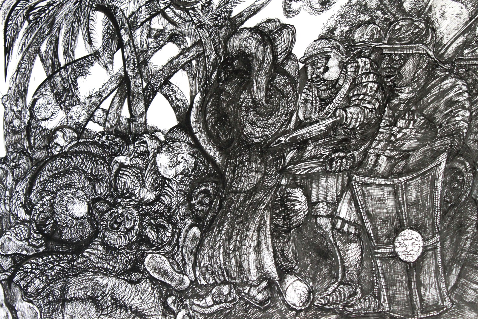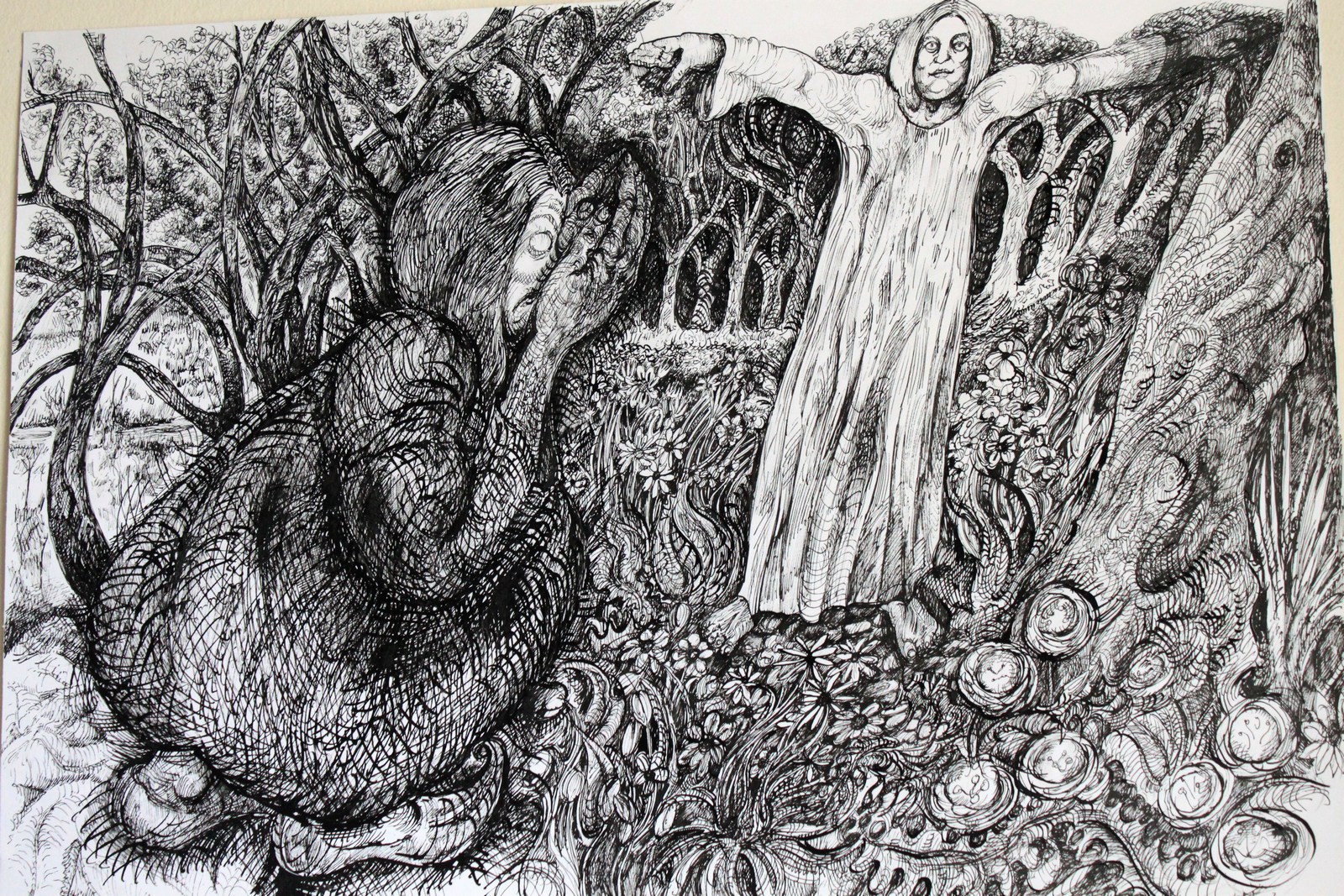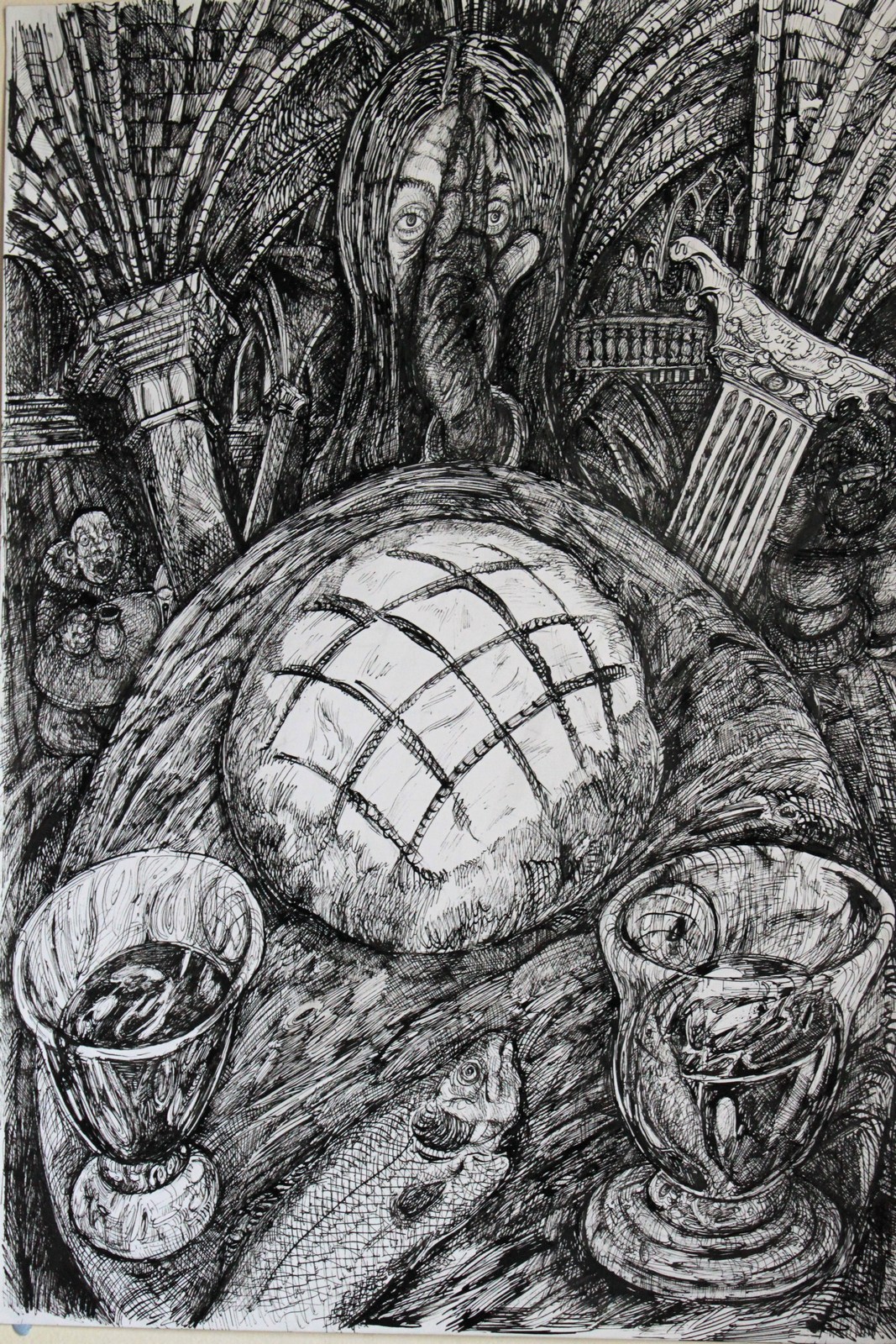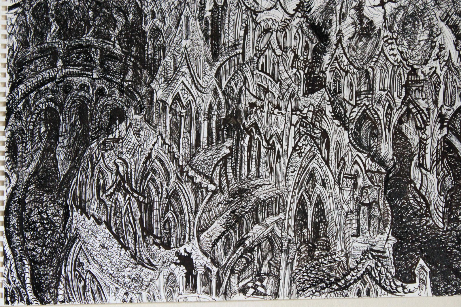 The medium is black ink. I have used an old-fashioned dipping pen and a variety of nibs. It was my intention to reproduce something of the visual power of late mediaeval German woodcuts. They are necessarily dark, both because of the subject matter and the method I have employed.
