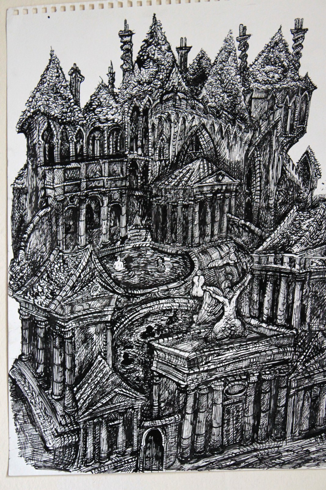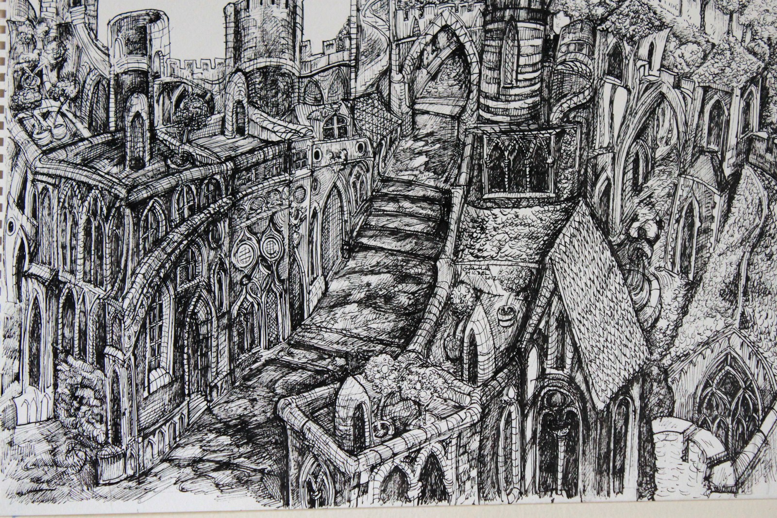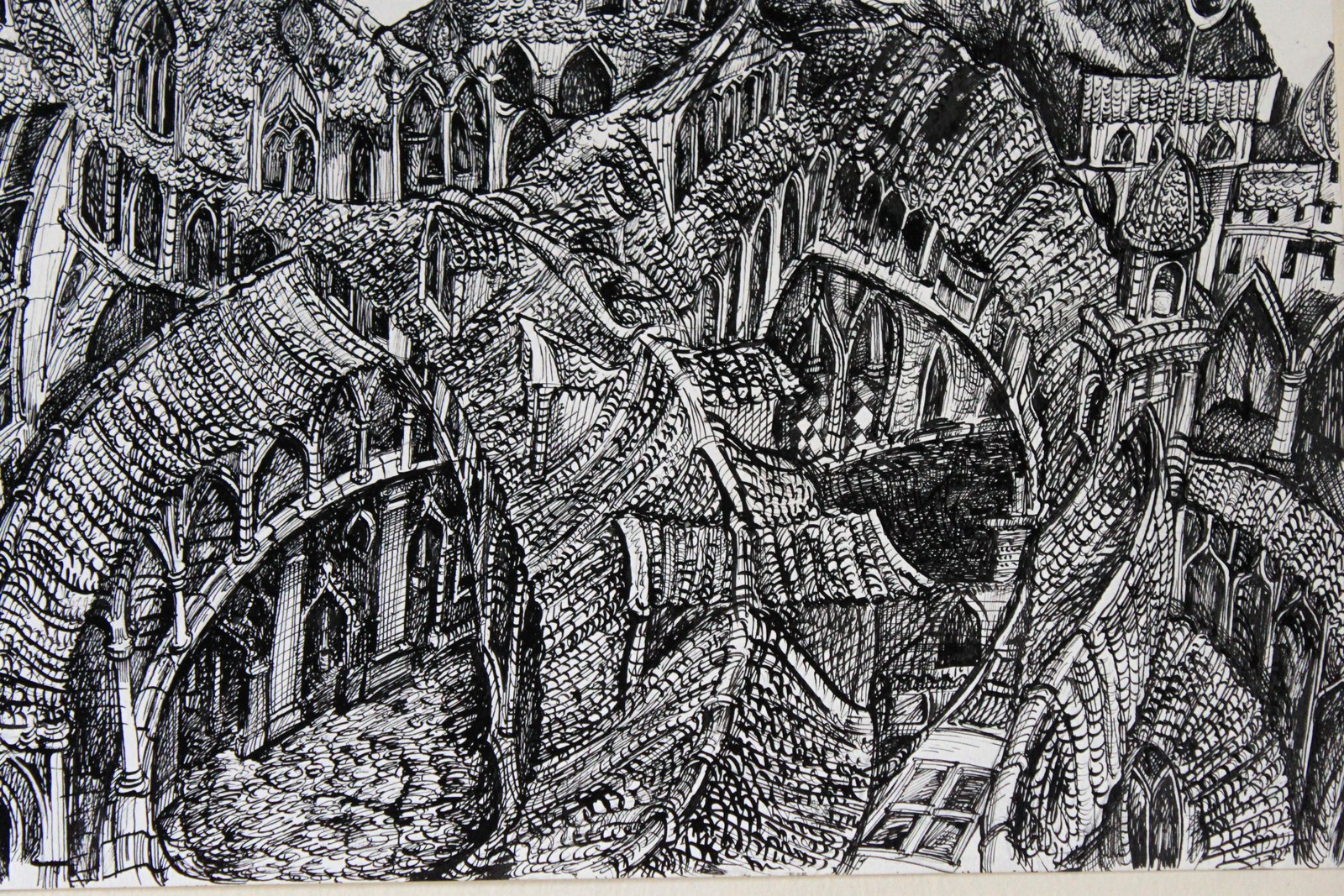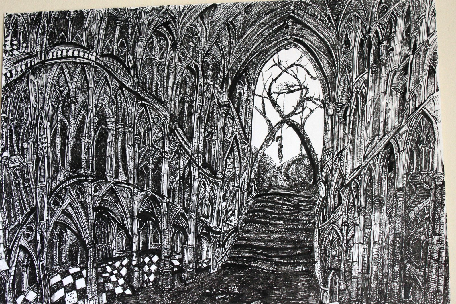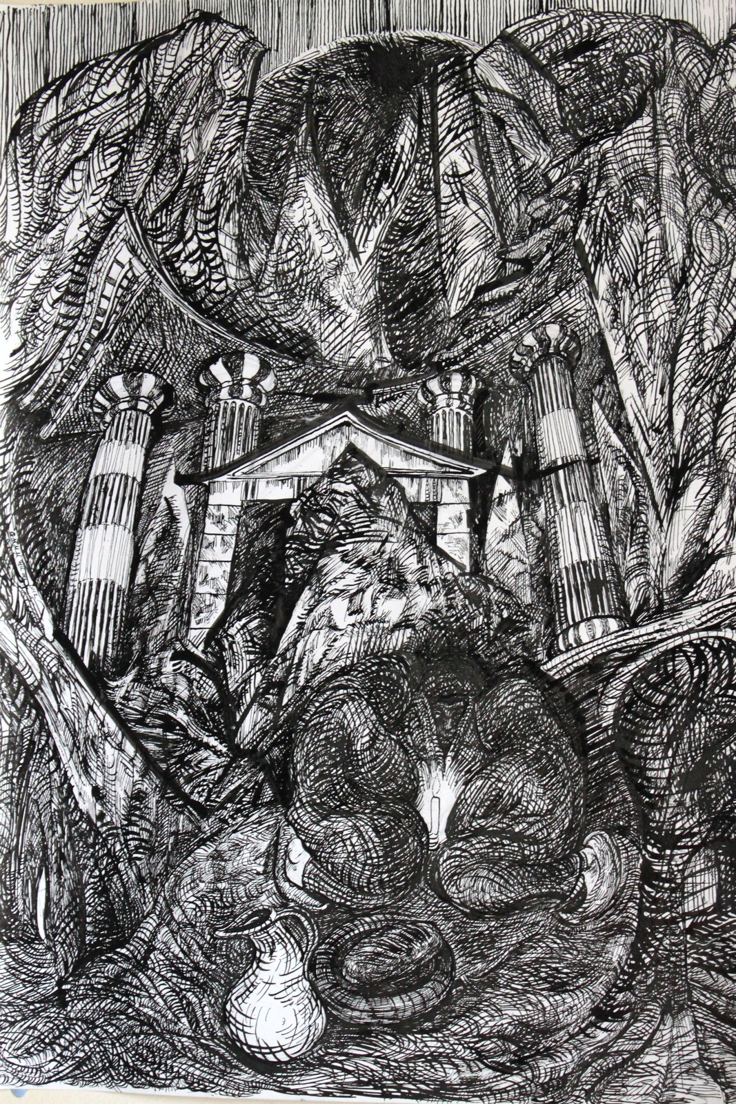 The medium is black ink. I have used an old-fashioned dipping pen and a variety of nibs. It was my intention to reproduce something of the visual power of late mediaeval German woodcuts. They are necessarily dark, both because of the subject matter and the method I have employed.